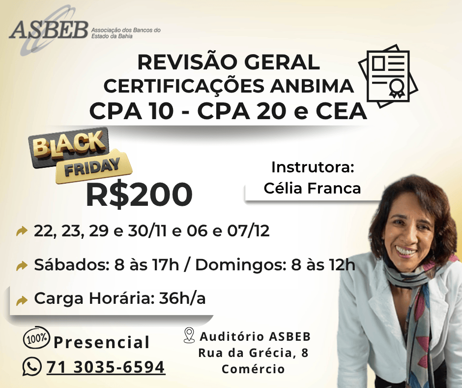 A partir de janeiro de 2026, a ANBIMA descontinuará as certificações CPA-10, CPA-20 e CEA. Não perca essa oportunidade para conquistar sua Certificação antes da mudança. Participe da nossa Revisão Geral com a professora Célia Franca e prepare-se para as Últimas Provas.